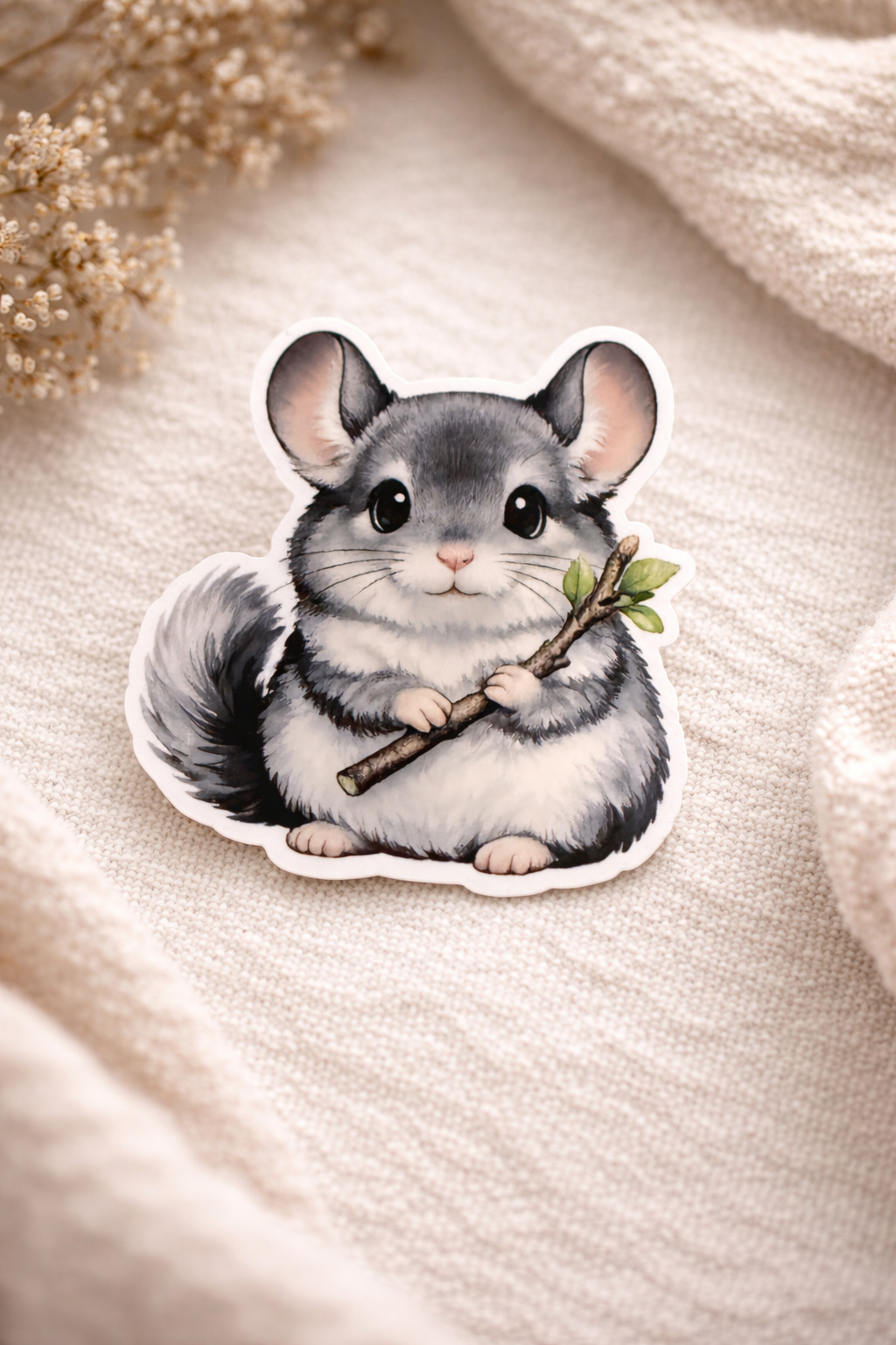 Suloinen chinchilla pitelemässä pientä oksaa. Täydellinen yksityiskohta läppäriin, juomapulloon, kalenteriin tai puhelimen kuoreen.