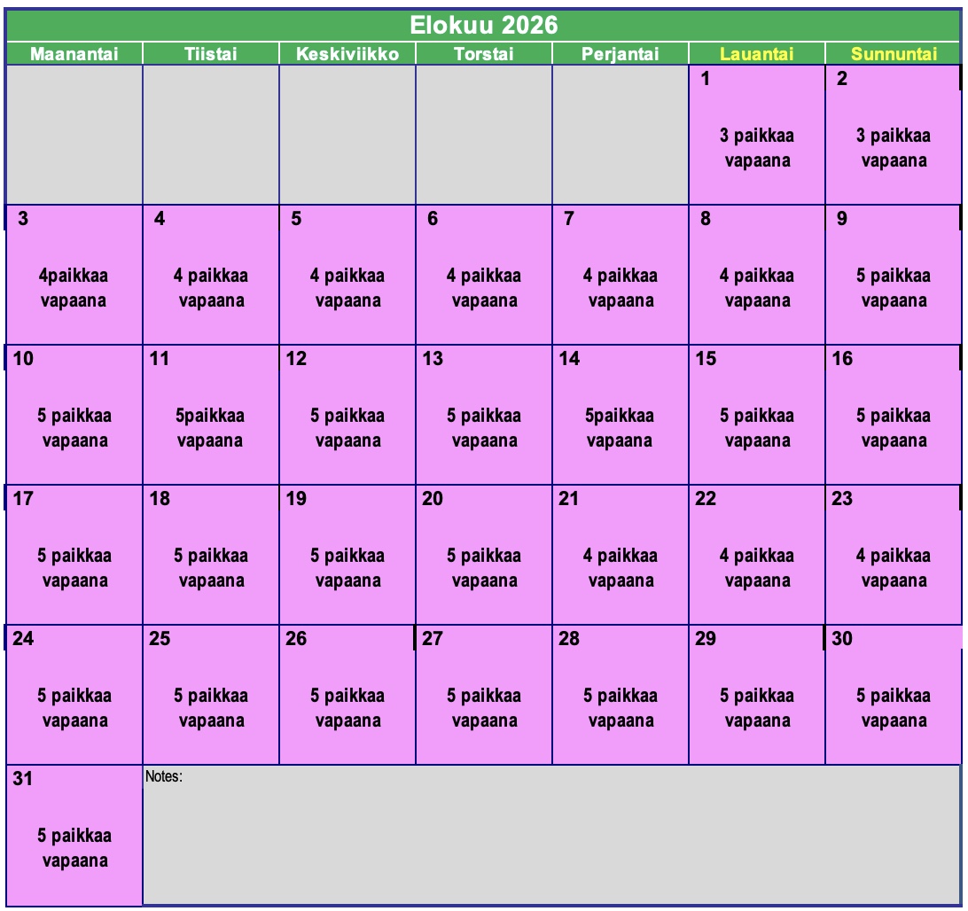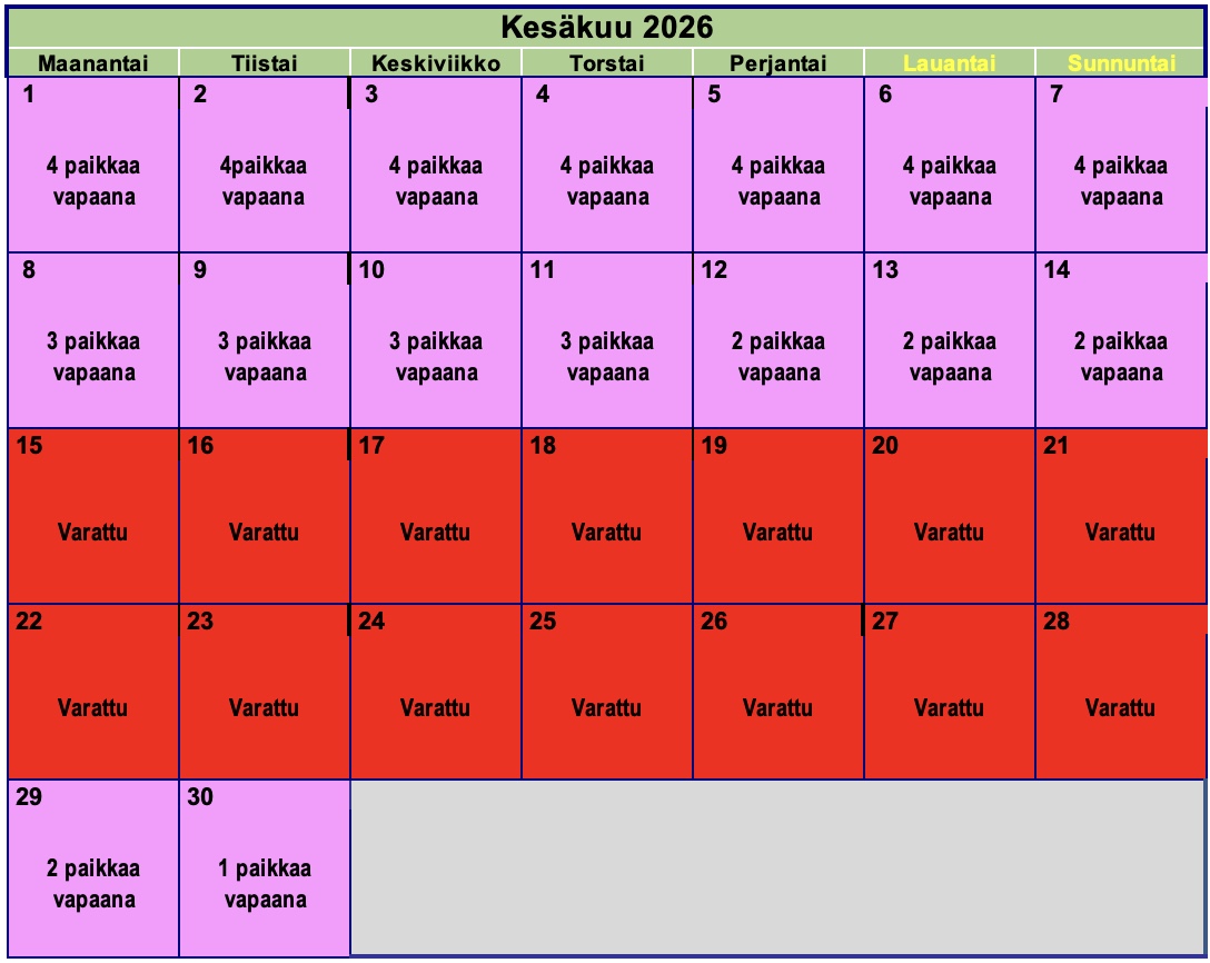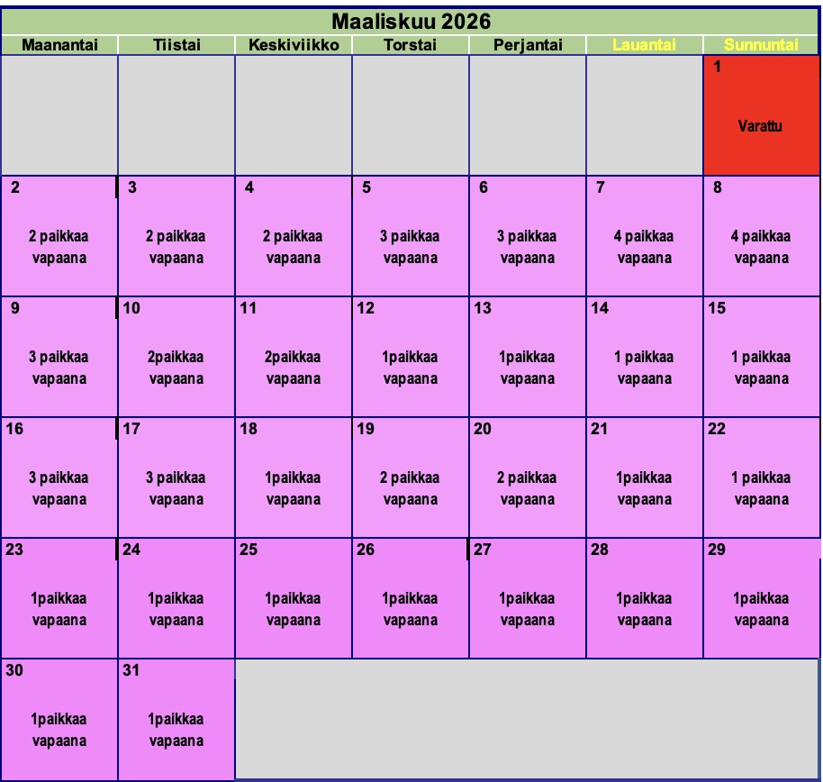 Varaus oheisen lomakkeen kautta tai vaihtoehtoisesti voit soittaa. Alapuolella on varauskalenteri, josta näet tämän hetkisen varaus tilanteen. Kalenteri on päivitetty aina ajantasalle.